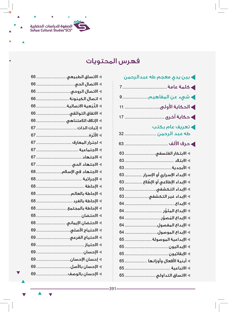 يحتوي المعجم على مفاهيم ومصطلحات طرحها المفكر د. طه عبد الرحمن في مختلف حقول العلوم والمعرفة؛ من فلسفة، وسياسة، واجتماع، وتواصل، وأخلاق.