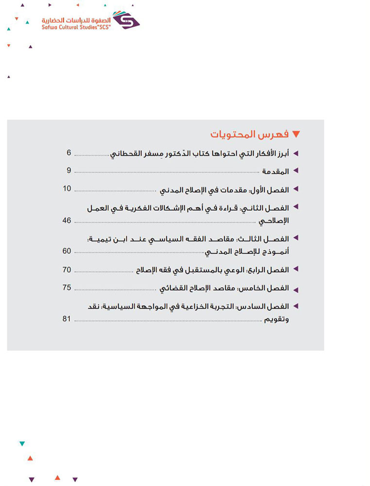 يبين الكتاب ما تم التوصّل إليه من مقدّمات الإصلاح المدني والقيام بواجب التغيير الرشيد للمجتمع، ويقارب أهم الإشكالات الفكرية في العمل بين التعنّت في التأويل ومخاوف التغريب، ويُبيّن قواعد الوعي المستشرِف في فقه الإصلاح وأهمية استشراف المستقبل وآليّاته.